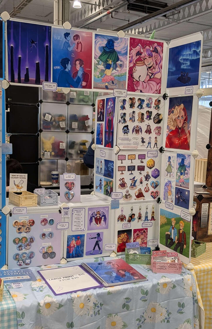 I have been breaking into the world of vendoring at conventions in the GTA, and I've had such a fun and inspiring start! I specialize in bright, lively illustrations featuring works from a variety of media that I enjoy.At my booth you'll find artwork from video games like Ace Attorney, Deltarune, and Minecraft, Youtube and Twitch content such as the QSMP, Life Series, and other Minecraft Youtubers, as well as TTRPG content such as Critical Role, TAZ, and more!