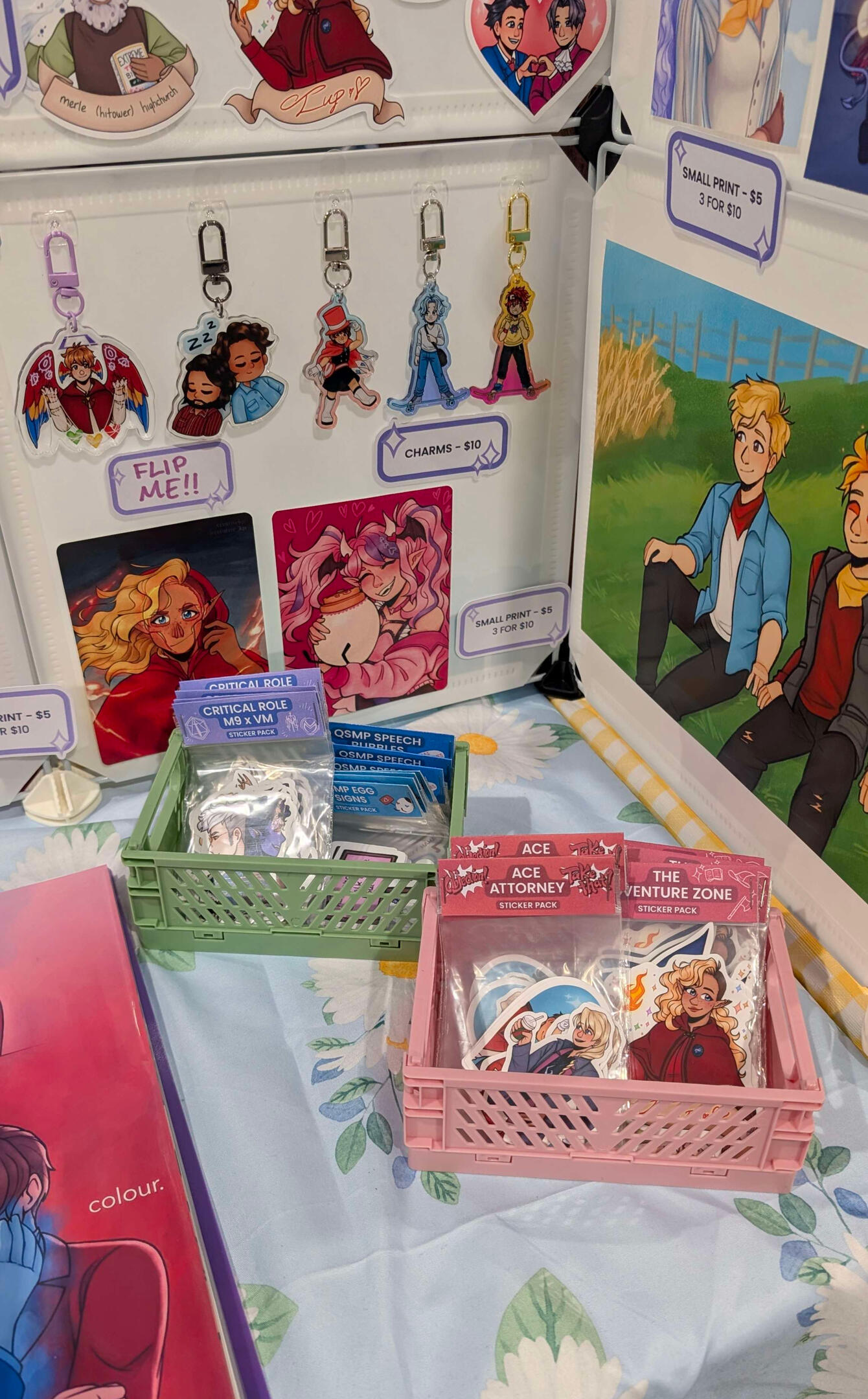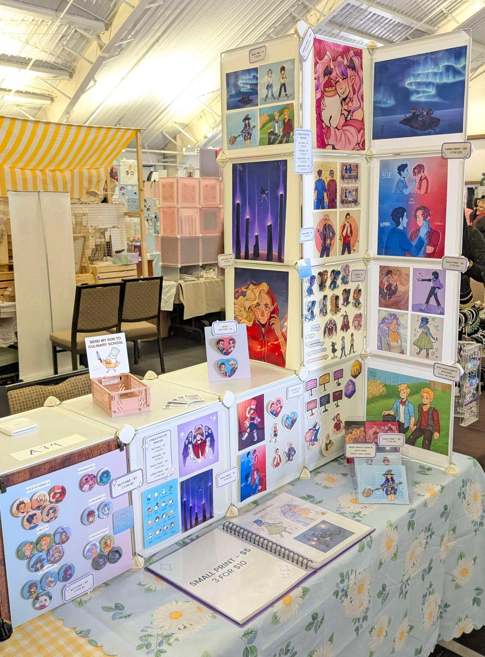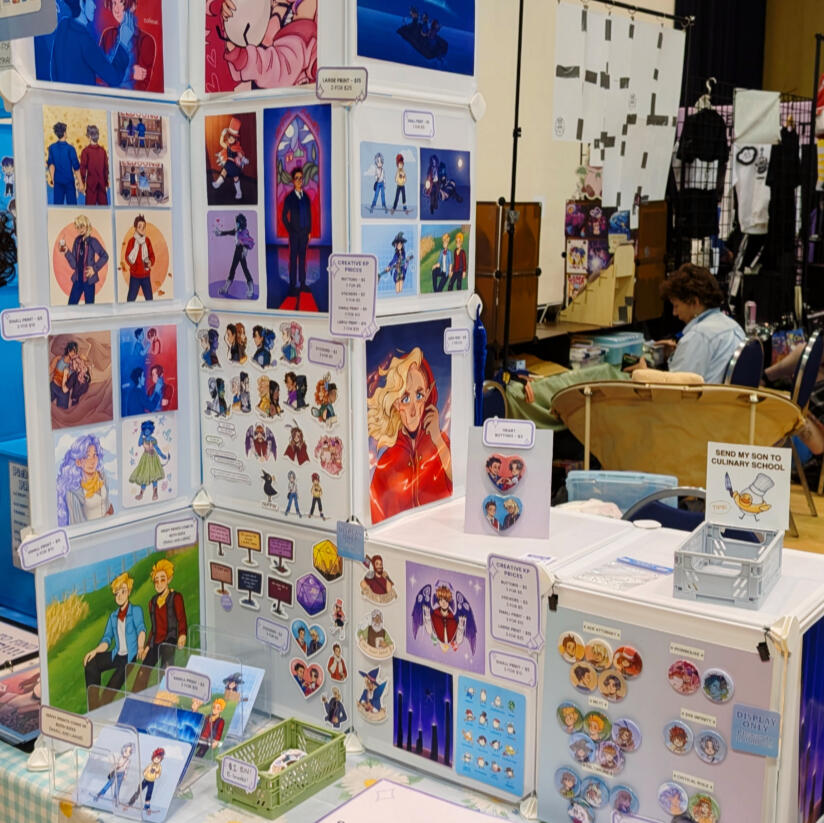 I have been breaking into the world of vendoring at conventions in the GTA, and I've had such a fun and inspiring start! I specialize in bright, lively illustrations featuring works from a variety of media that I enjoy.At my booth you'll find artwork from video games like Ace Attorney, Deltarune, and Minecraft, Youtube and Twitch content such as the QSMP, Life Series, and other Minecraft Youtubers, as well as TTRPG content such as Critical Role, TAZ, and more!